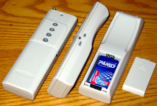 发射手柄上设置有四个按键,当按动时发射机上的按键,发射电路会被激活而进入发射状态,发射机静态时不耗电。机内装配的电池只被用于点发射状态。当用于报警设定和电器开关时,每节电池一般可用到一年以上,电池的容量为45mAH。